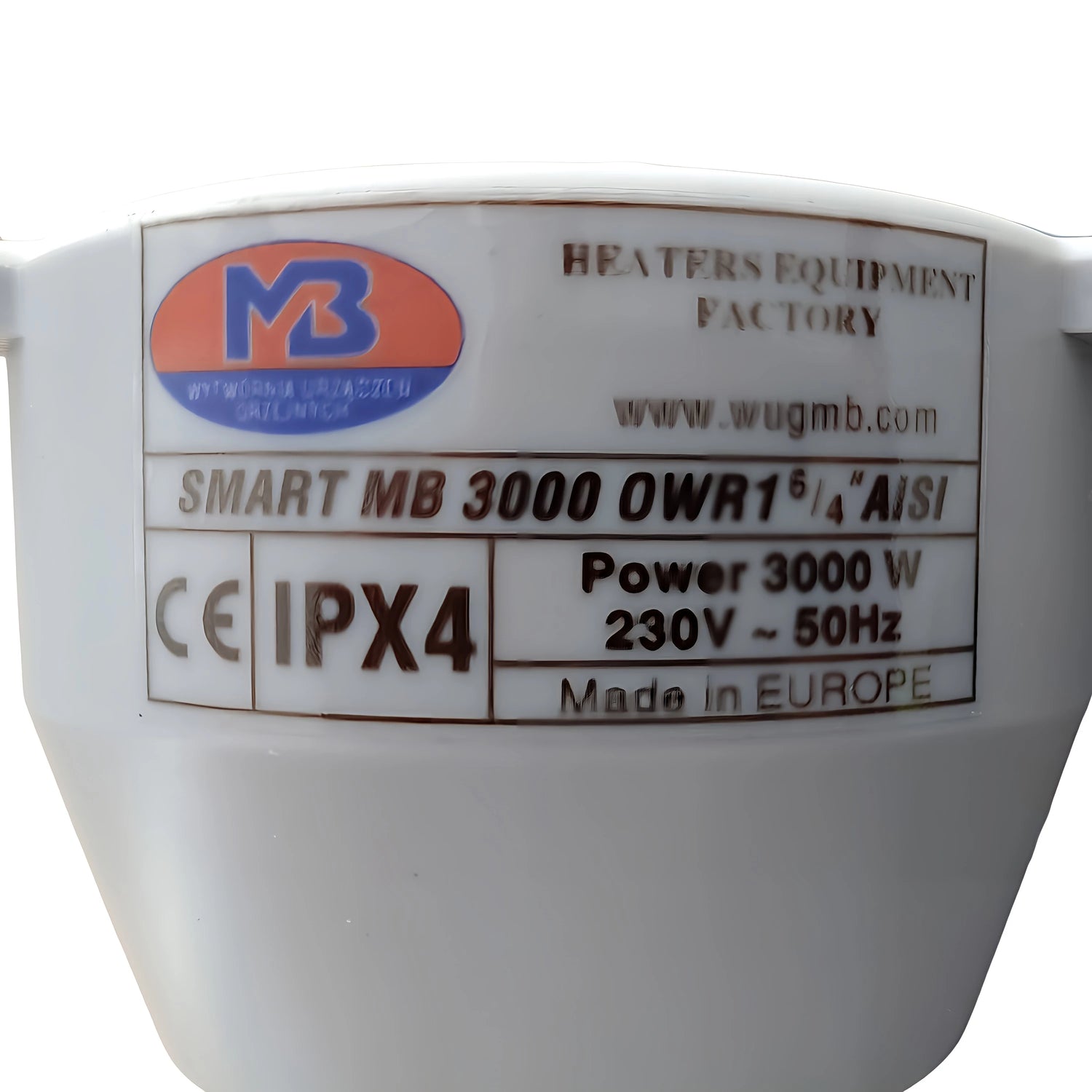 OWR1 SMART varmeelementet leverer 3,0 kW ved 230 V og er designet til vandret montering. Det har en 1 1/2" Enheden har AG-tilslutningsgevind, en holdbar fornikling og leveres med et Schuko-stik for nem installation. En justerbar regulator dækker temperaturer fra cirka 10°C til cirka 75°C, suppleret af en sikkerhedstemperaturbegrænser på 85°C.