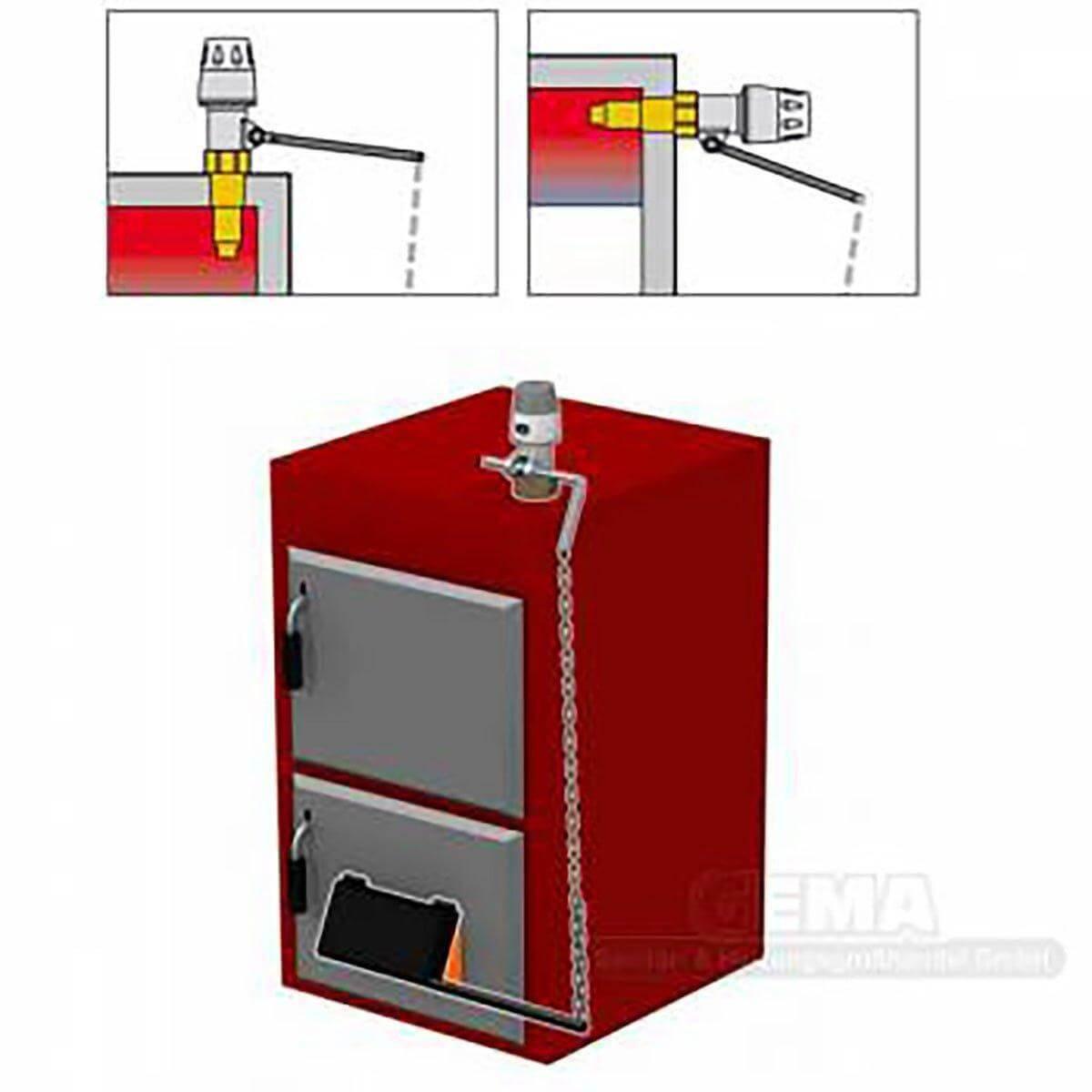The temperature in the heat generator is measured by an integrated thermostat. The thermostat is connected to the supply air damper via a lever rod and a chain. Depending on the boiler flow temperature, the air supply is regulated by opening or closing the supply air damper. For temperature-dependent adjustment of the supply air damper on solid fuel and variable-combustion boilers.