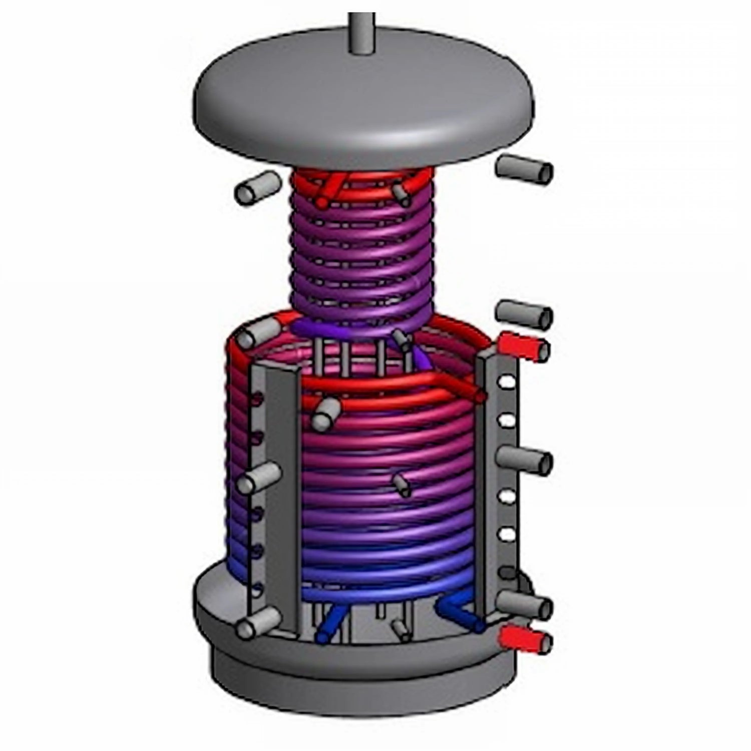 O tanque é feito de aço S235JRG2 de alta qualidade, conforme DIN 4753/EN 12897, e o trocador de calor para água potável é feito de tubo corrugado de aço inoxidável 1.4404 (fabricado na Alemanha). O tanque não é tratado internamente e recebe primer na parte externa, com as conexões do trocador de calor para água potável localizadas na lateral.