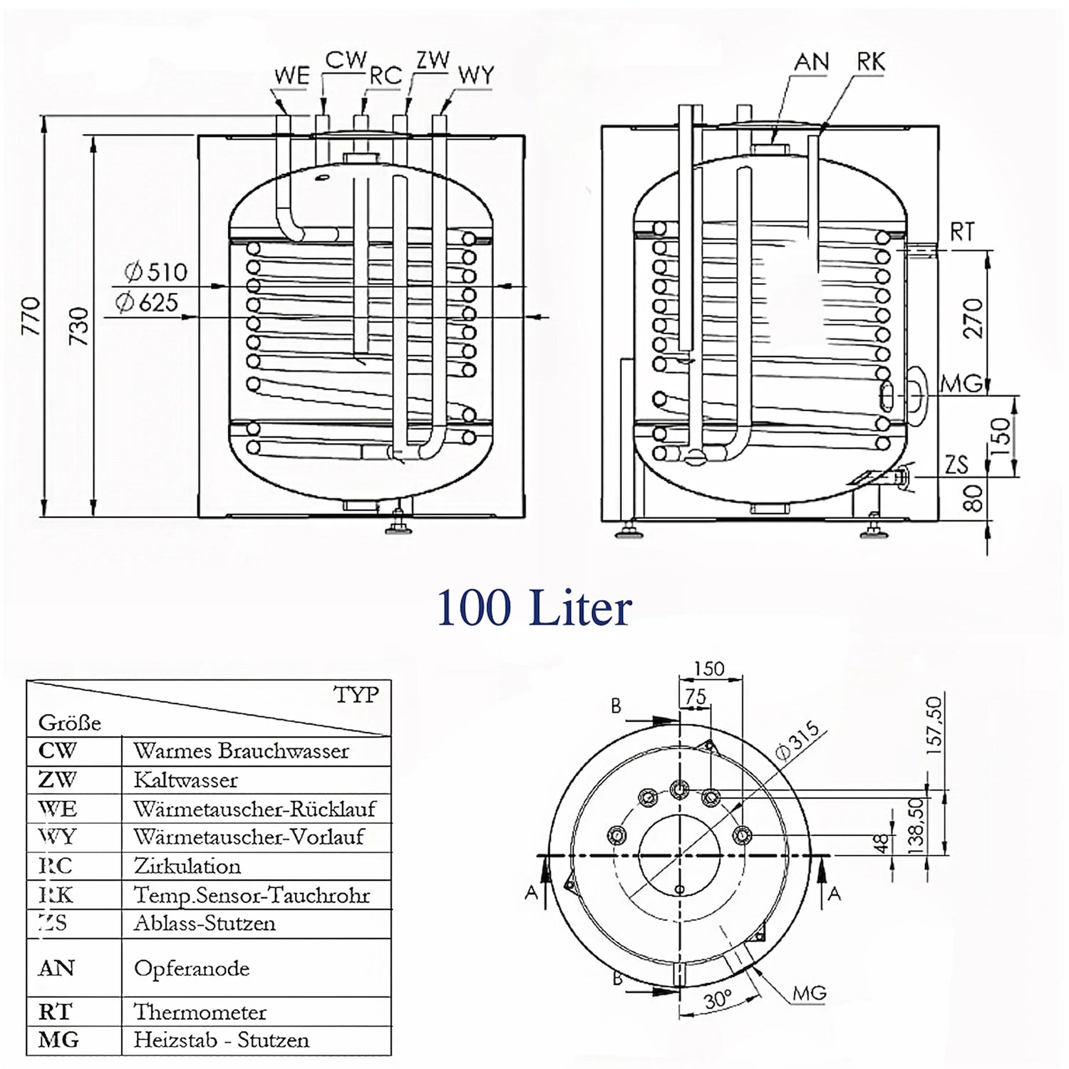 Schimbătorul de căldură de înaltă eficiență încălzește Apă potabilă/apă de proces în interior, prin intermediul energiei termice provenite de la o sursă termică sistemul solar sau de la o centrală termică. O opțiune suplimentară pentru încălzirea apei calde este conectarea Sistem fotovoltaic cu un sistem de montare ulterioară de 1 1/2" element de încălzire, care este conectat la rezervorul de apă potabilă. Pentru o durată lungă de viață, rezervorul de apă caldă este prevăzut cu protecție împotriva coroziunii sub forma unui strat de email de înaltă calitate. Un anod de magneziu încorporat (anod protector, sacrificial) oferă protecție suplimentară împotriva coroziunii în interiorul rezervorului.