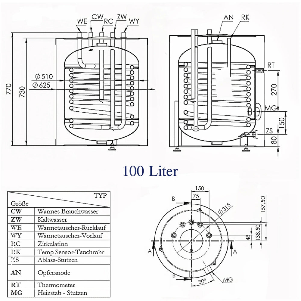 ETWS varmvattenberedare pÄ 100 liter erbjuder en centraliserad och sÀker lösning för uppvÀrmning av varmvatten. Den Àr idealisk för att tillgodose behovet av varmvatten via en högeffektiv vÀrmevÀxlare och kan anvÀndas i bÄde bostÀder och kommersiella tillÀmpningar.
